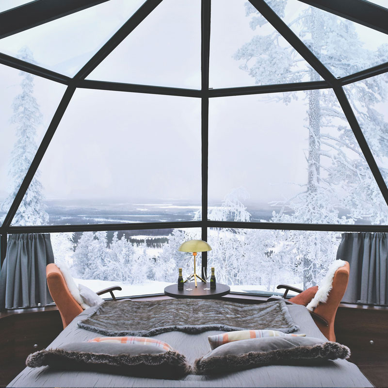 Each glass igloo has a kitchenette, shower and toilet. The windows are insulated and electrically heated to keep them from frosting. The kitchenette is equipped with a breakfast set, electric stove, microwave, coffee maker, kettle, toaster and fridge. In addition, the igloos have a radio/CD player, a hair dryer and a socket for car engine heaters. At the centre of the igloo is a motorised double bed that can be converted into twin beds, from which you can admire the scenery and, if you’re lucky, the Northern Lights. The Superior Igloos also include a comfortable sofa bed as additional bedding.