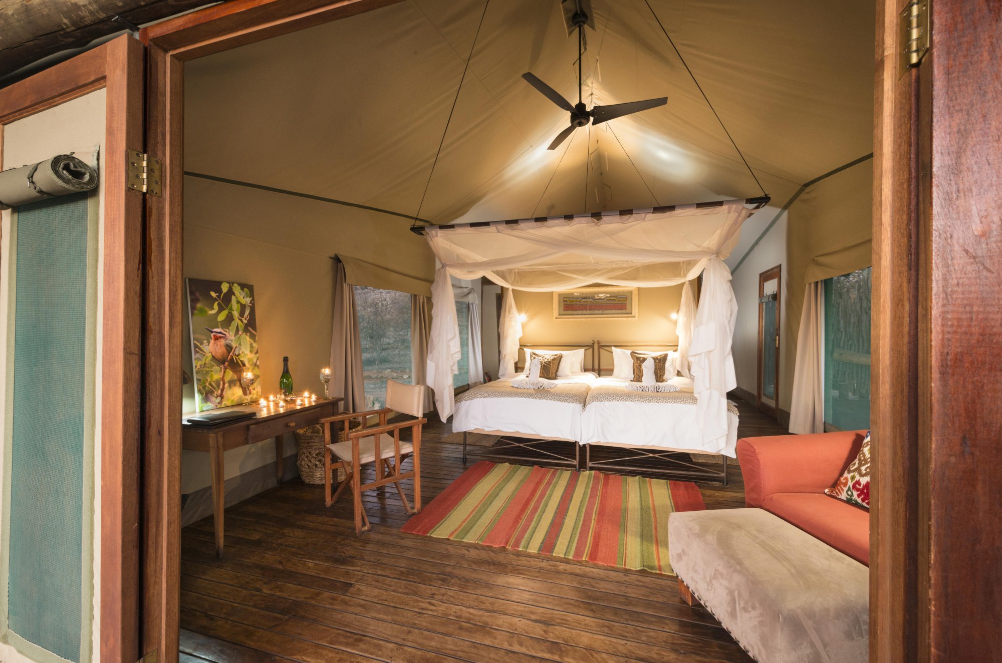 Eight large comfortable Meru-style tents all have en-suite facilities, open air showers and private verandas; the family unit sleeps four. The main area, built of stone, canvas and thatch, fronts onto a much-frequented waterhole; watching wildlife coming to drink from here or from the swimming pool is a favourite pastime.