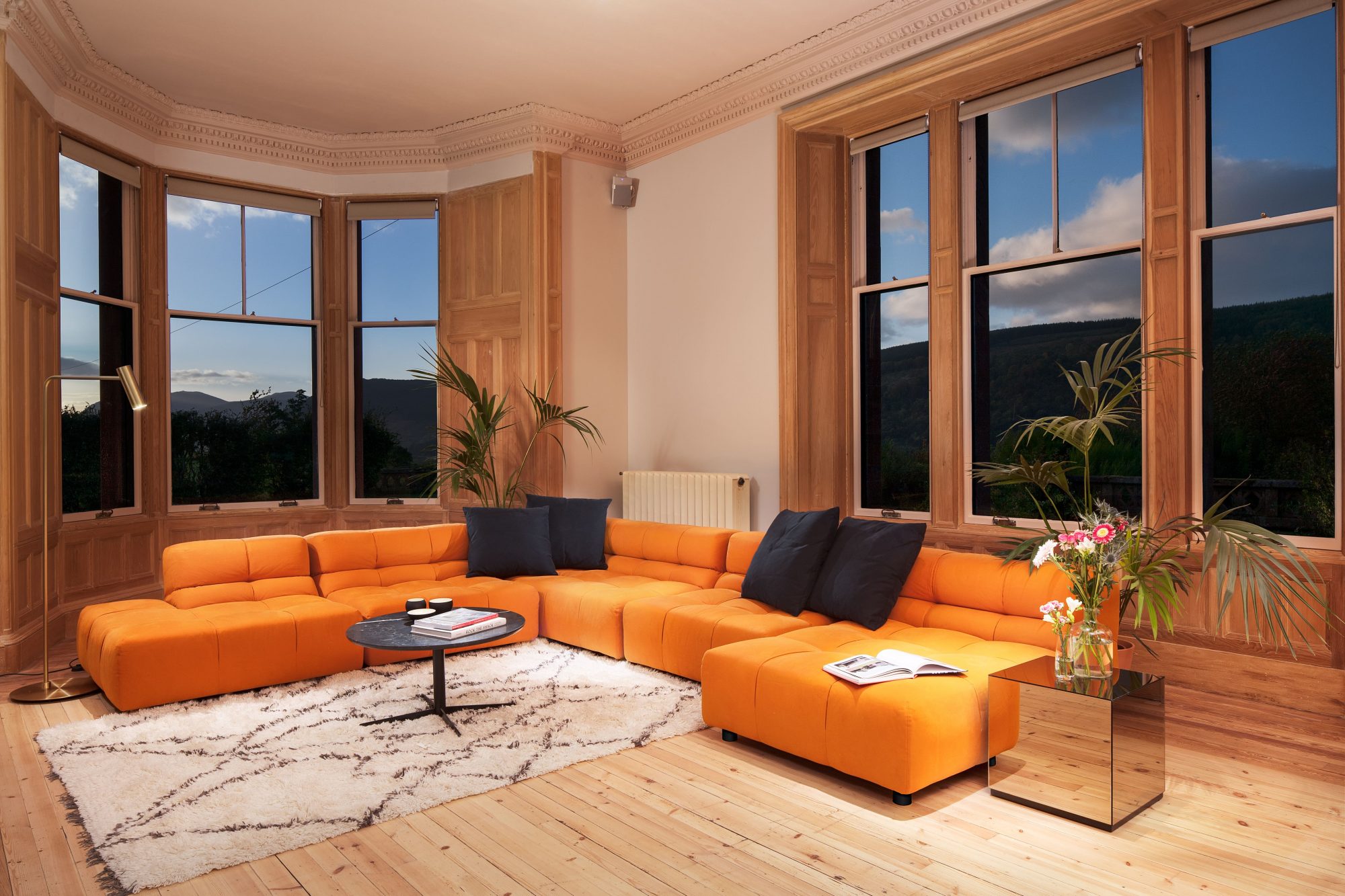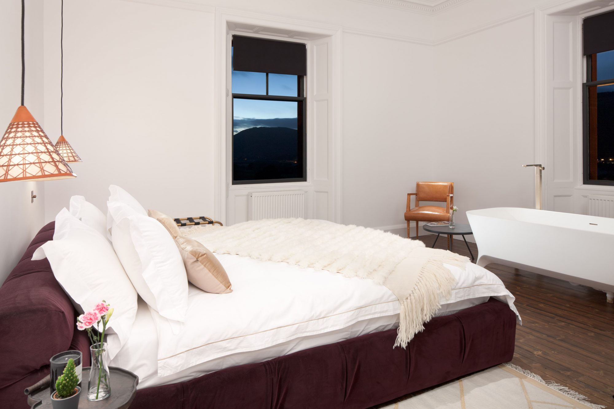 Aberfeldy Retreat is an exclusive use venue situated in Aberfeldy Perthshire, Scotland. The house sleeps up to 18 guests in 9 sumptuous individually designed bedrooms, each with a private en-suite bathroom. Situated on an elevated site overlooking the town of Aberfeldy and the sweeping River Tay, Aberfeldy Retreat enjoys 5.5 acres of private grounds with an extensive terrace with stunning views down the Tay Valley to Schiehallion. Enjoy the views down the valley, in our Wood Fired natural cedar Hot Tub, nestled in the woods beside the house, large enough for 10-12 guests. Aberfeldy Retreat is available for hire as an Exclusive Use venue with catering provided by our partners Ballintaggart Farm, with full housekeeping, butler and concierge services. We will create totally unforgettable Highland Experiences for our guests together with our local world-class partners, from whisky tours & tasting to salmon fishing on the River Tay.