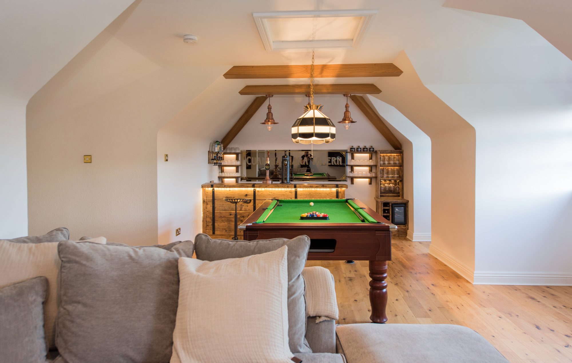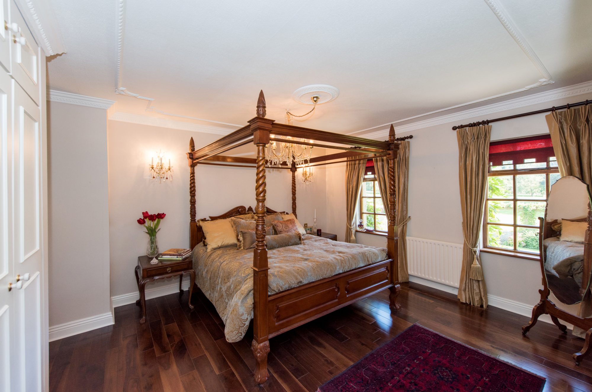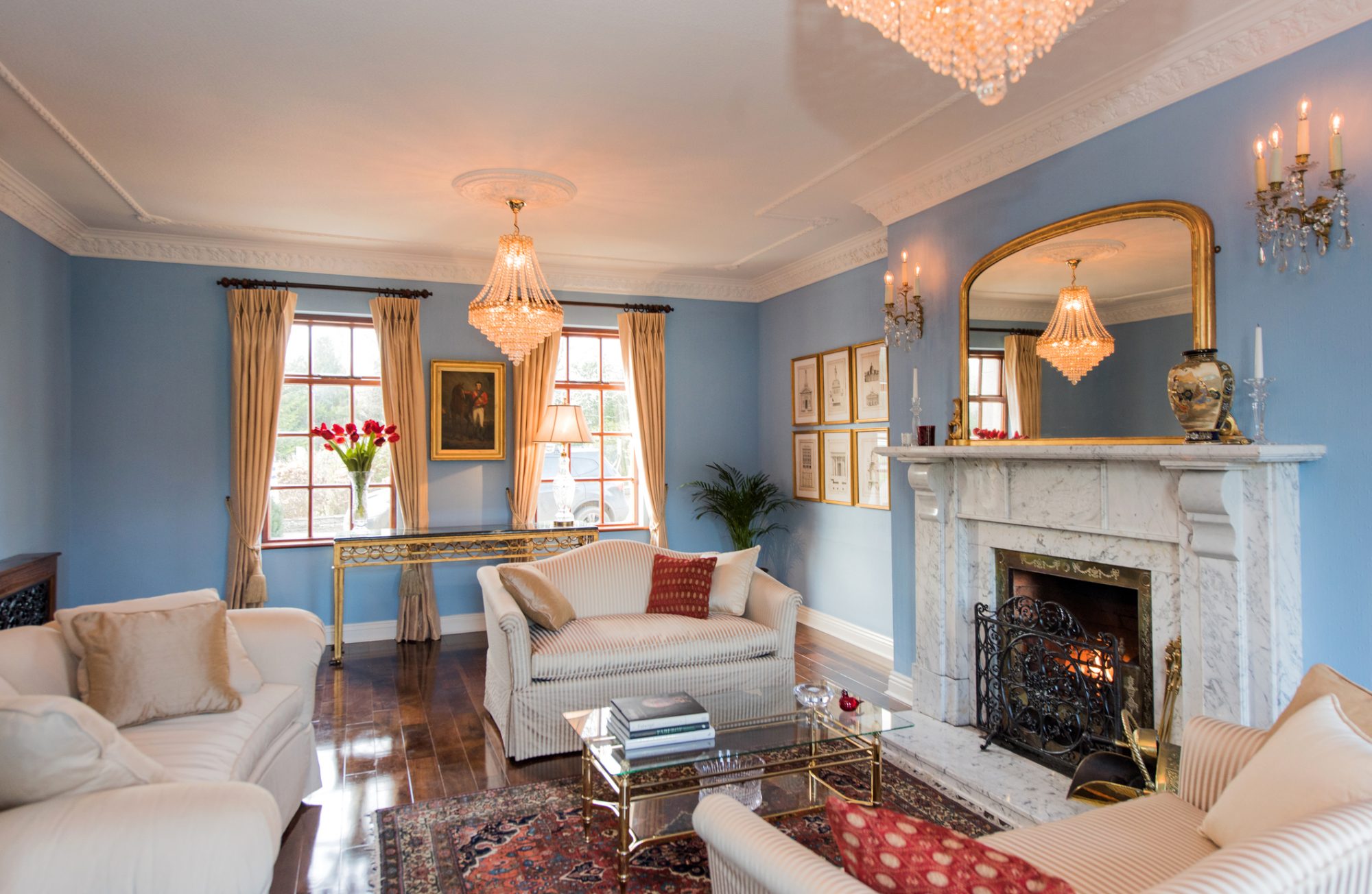 Furnished throughout with antiques, Waterford crystal chandeliers, mahogany floors and marble fireplaces, the main house has four bedrooms, three full bathrooms, large kitchen, living room with fireplace, dining room with fireplace (table seats 10), and family room with fireplace. The entire third floor is a games room with pool table and full bar with Guinness & Carlsberg on tap. There is a workout room with sauna and full bathroom, golf pro shop, stained glass gazebo, and huge wrap-around blue stone patio. In addition, there is an air conditioned, two-bedroom guest cottage just off the main house with kitchen, living/dining area, full bathroom and a loft.