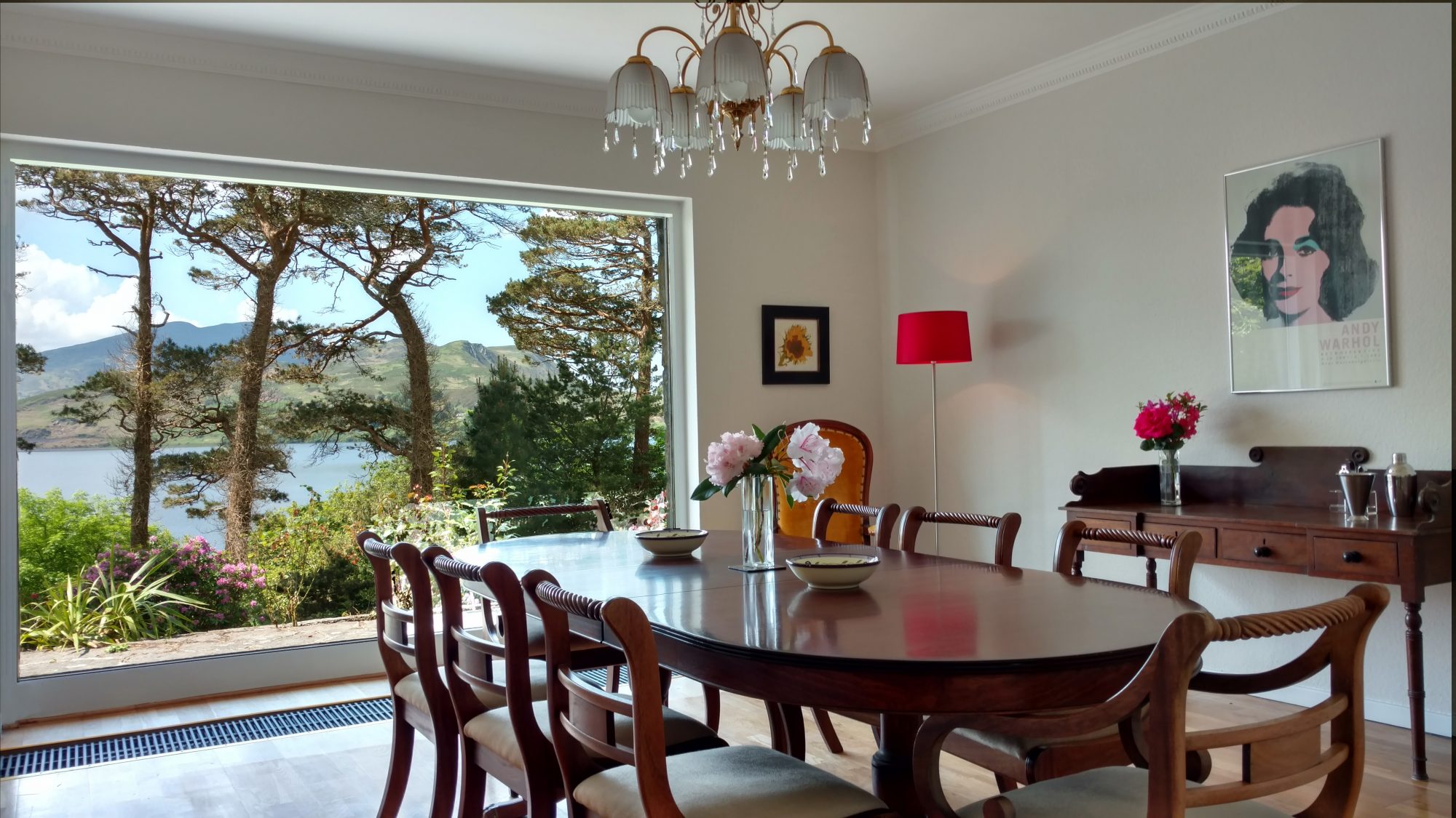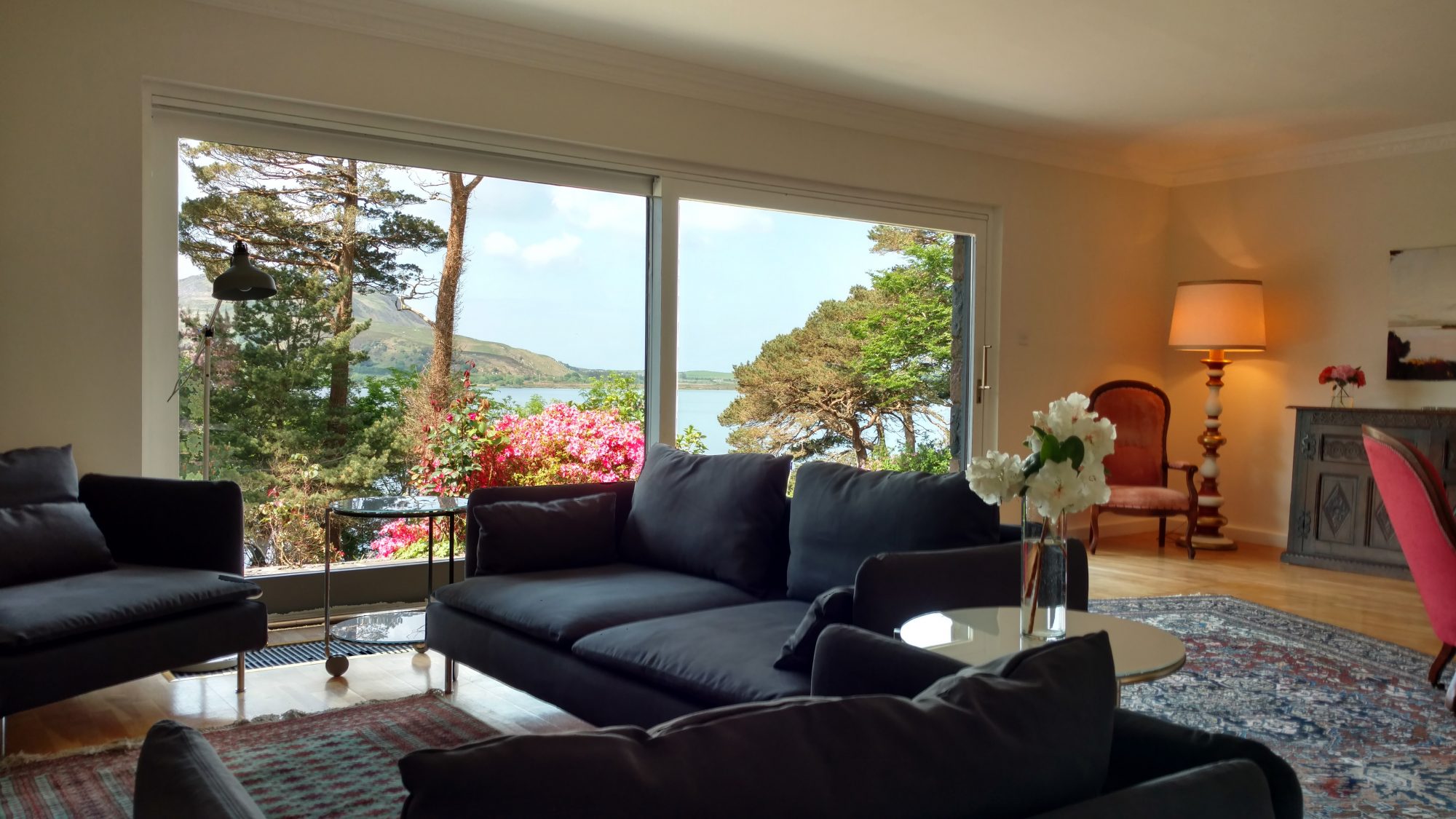 Killarney Lake House is a large six-bedroom lakeside vacation rental with breath-taking views of Caragh Lake, Seefin Mountain and the Dingle Peninsula. Recently updated with all modern conveniences, the house combines original charm and character with stylish contemporary interiors. The main living room has a large open fire, perfect for those lazy evenings. Timber is provided. The house sleeps 12 people and along with the six bedrooms, it has six bathrooms. Each bedroom has 100% cotton sateen sheets with white goose down duvets and pillows. There’s a raised stone patio outside overlooking the lake with ample seating to relax and dine al fresco along with a Weber barbecue for those long summer evenings.